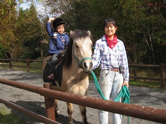 ジャングルバスの時間まで有佳里と光汰朗は、乗馬に挑戦した。 | 有佳里は大きな馬に乗ると張り切って順番を待ち、馬にまたがった。 ほんの数分間の乗馬だったが、楽しそうに乗っていた。 光汰朗は、始め怖がって乗るのは止めると言っていたが、説得されてコワゴワと 馬にまたがったが、すぐに笑顔になって乗馬を楽しんだ。