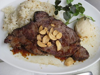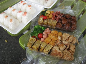 昼食は かつカレー、牛肉ステーキ、ラーメンなどを外の丸テーブルで食べた。 | 室内スペースは、ザワザワと騒音がひどく落ち着かないので外のスペースに。。 すごい混雑なので、まず場所取りをし、主人と子供達に座ってもらい、その間に 美映夫婦と私の3人で並んで食べ物を買ってテーブルに運んだ。 かつカレーは美味しかったが、ステーキは肉が硬くイマイチだったが、値段が 安かったので、納得した。(笑)