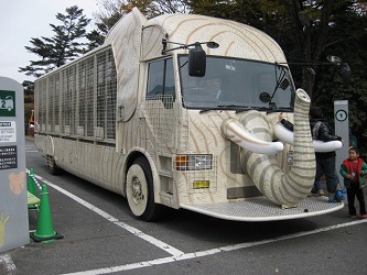 美映手作りの美味しいお弁当を食べて、いよいよゾウさんのジャングルバスに乗り込んだ。 | バスは他にライオン、トラ、かばなどがあったが 写真は→ここ ライオンが1番人気のようだ。 チケットと引き換えに6人分の餌をもらった。 骨付きの鶏肉、人参、りんごなどだ。