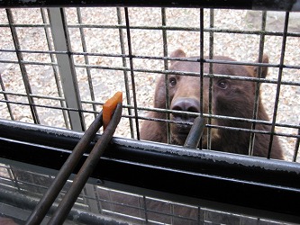 ガイド役もやる運転手から面白おかしく説明をしてもらいながら、バスはクマゾーンに入った。 | バスを見ると餌がもらえると分かっていて、熊たちが集まってきた。 餌をトングではさんで有佳里に持たせたが、やはりちょっと怖くて、手を離すと 餌は地面に落ちてしまった。 次からは私も一緒にトングを持って、餌をあげた。 熊も迫力があったけど、やはり百獣の王のライオンは、凄かった。 こんなに間近で肉を食べる仕草を見る事が出来、少し興奮気味だ(笑)。 そのビデオは ここ