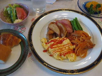 朝食は前もって和食と洋食のを好みでどちらかを注文しておいた。 | 主人が和食、私は洋食にした。 きのうの夕食を食べ過ぎたせいで、あまりお腹が すいていなかったので、主人に手伝ってもらった。