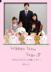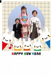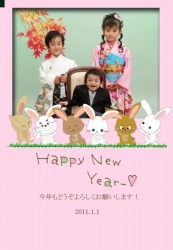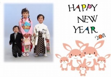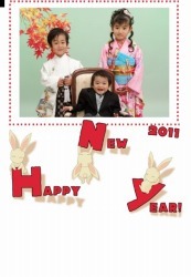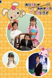 有佳里のドレス姿、光汰朗のタキシード姿も可愛かったが、年賀状なら | 着物姿の方がいいと思い、縦型6枚、横型1枚のいろんなパターンで作ってみた。 以外と時間がかかる作業なのだが、始めると熱中してしまい 時間のたつのも 忘れてパソコンに向かっていた。 私って、こういう作業が大好きなんだと思い出した。 私専用のパソコンを始めて買った頃から 写真入り、画像入りのハガキを作るのが 面白くて、毎日パソコンに向かっていた。 デザインが次から次へと頭に浮かんできて楽しくて仕方がなかった。 ご無沙汰している友達などに季節の画像を入れて、葉書を作って送った。 筆不精な私が、筆まめになるなんて。。(笑)