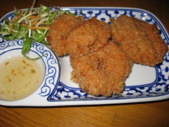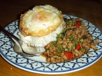 エビのすり身揚げは、プリプリとした触感が残っていて主人は美味しいな〜と気に入った様子。 | 香草バジル牛肉・豚肉炒めは上に乗った目玉焼き(油で揚げた)とご飯とお肉を 混ぜて食べる料理で、辛くないので、辛さが苦手な人に人気があるそうだ。