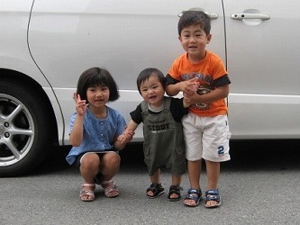明日は月曜日。 学校、幼稚園もあるし、三太さんは仕事だしと云う事で、 午前中に愛知へ帰ることになった。 その前に。。。 長い距離を歩いている朝大を見たいとマンションの廊下で歩かせた。 そのビデオは →ここ 3人一緒の写真を撮ろうとカメラを向けたが、3人同時にカメラの方をを見るのは 至難のわざ!。 何枚もうつした結果、なんとか可愛い写真が撮れた。 デジカメは、削除が出来るから何枚写しても大丈夫! みんなが帰った後は、嵐が去ったような静けさになった。(笑) また、夫婦2人だけのいつもの生活に戻った。 この次は、いつ会えるかな〜〜