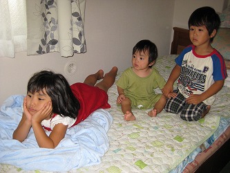 主人のベッドの上で録画してある「ドラえもん」を真剣に見ている3人。 | 朝大も一緒になって見ている様子に大笑いした。 兄弟っていいね。 ママとパパが日光のアイスリンクで以前所属していたアイスホッケーチームが 練習をしているとの事で夕飯の後に2人で出かけて行った。 朝大が心配だったが、泣きもせずに遊んでいた。 主人と私と子供達5人で布団に入り、電気を消して寝る体制に入ったら、あっという間に 朝大が寝てしまった。疲れていたのかな? 有佳里と光汰朗は、なかなか寝なかったが、知らんぷりしていたらいつのまにか寝ていた。 今夜のお留守番は楽ちんだった。(笑) 12時頃にママとパパは帰ってきた。 早朝に愛知を車で出発し、長時間の運転で疲れているのではと心配してしまう私だが、 アイスホッケーのようなハードな運動を平気でこなす2人は、とてつもなく元気だと感心した。 |