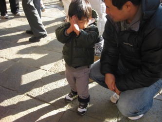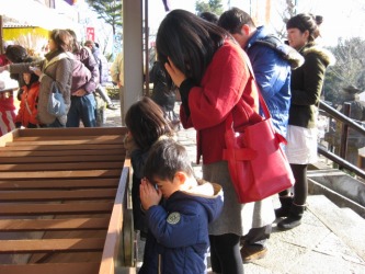 護摩焚きが始まる10時まで、少し時間があったので、貞治と美映家族はおみくじを | 引いたりしていた。 大吉やら末吉が出て、喜んだり、ちょっとがっかりしたり。。 孫4人、一緒の写真を撮るのに、全員がこっち向いて欲しくて何枚も撮ったが とっても、無理!(笑) でも、ま〜ま〜の写真が撮れたと満足した。 お賽銭をあげて、子供達が手を合わせてお参りしている可愛い写真も撮れた。 本堂に入り、いよいよ護摩焚きが始まった。 ビデオは→ ここ 今年1年の家内安全、無病息災、交通安全を祈願してもらった。 お坊さんのお経とお腹にひびく迫力ある太鼓の音、そして経木の燃える音を聞き 家族揃って新年を迎える事が出来た事が有難く感謝の気持ちで、護摩焚きを見ていた。