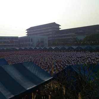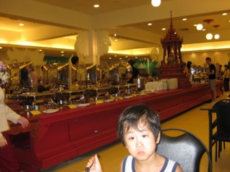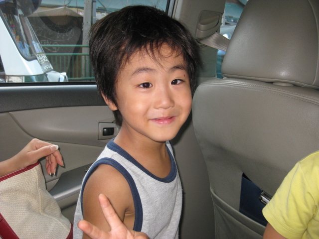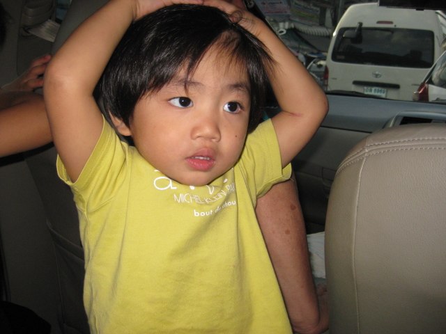 子供達の帰りを待って、今日のメインイベントの「サイアム・ニラミット」に出かけた。 | タイの渋滞は有名だが、特に金曜日の夕方からが混むらしい。 それで5時半開園なので、余裕を持って4時半にマンションを出発した。 考えが甘かった。 ほとんど動かないような渋滞が延々と続いた。 子供達は飽きて後ろの席で大騒ぎを始めた。 3歳になったばかりの朝大は、大声を出して光汰朗と、ふざけている。 そして後ろの座席から前の座席へと、行ったり来たりの移動を始めた。 美映が叱っても全然、言う事を聞かない。 第1次反抗期なのかもしれないと思っても、車の中での移動は危ないので、 私が後ろを向いて、大きな声で怒り、おしりをたたいた。 私が怒ったので、キョトンとした顔をしただけで、朝大は相変わらず、悪ふざけを続けていた。 朝大のビデオを撮り、デジカメで再生して見せると喜んで、いっときは静かになった。(笑) 朝大のビデオは ここ 子供が3人とは、こんなに大変な事だと改めて、思い知った。