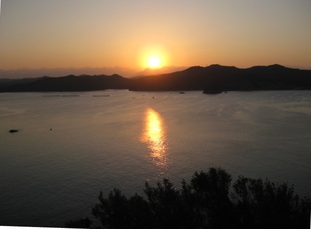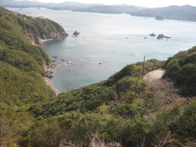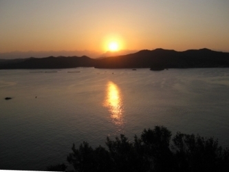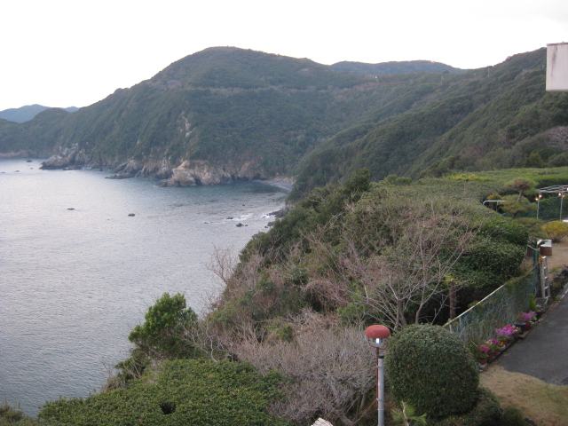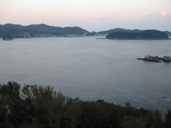4時30分頃に内宮の駐車場を出て、南伊勢の礫浦(さざらうら)の宿に着いたのは 5時30分頃になった。 部屋から海を見た。 五ヶ所湾を見下ろす高台に建つ宿のため、見晴らしは最高!絶景! この旅館の口コミを読むと、活きのよい新鮮な魚介を贅沢に使った料理と 五ヶ所湾を見下ろす展望は180度のパノラマの風景が素晴らしいとの意見が多かった。 小さな旅館で建物が古いのが難点と思ったが、美映と相談してここに予約した。