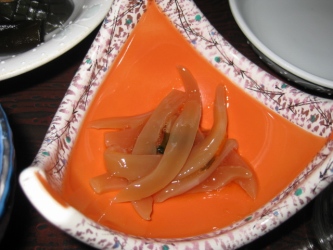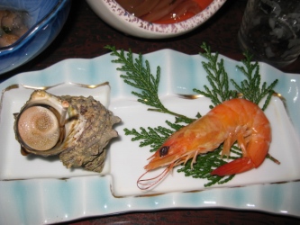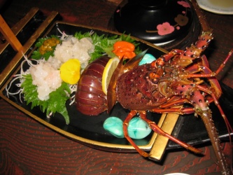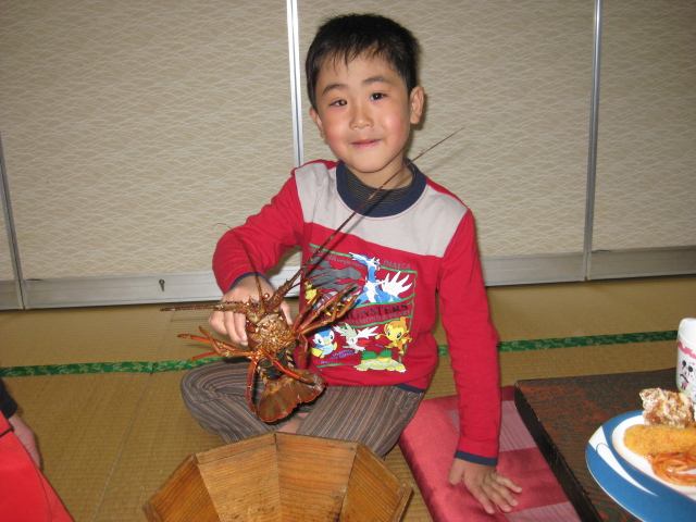 楽しみにしていた夕食が始まった。 | 電話で伊勢海老のお造りを特別料理として頼んでおいた。 お造りにする前に生きている伊瀬海老を見せてくれた。 光汰朗に持たせてくれたが 元気に動いていた伊瀬海老だったのに、ほとんど動かない。 →ここ 残念だねと桶の中に置いたとたん、はね回って大暴れしていた。(笑)