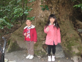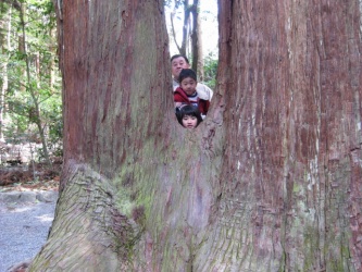 巨大杉の木の太い根元の前に有佳里と光汰朗を立たせて写真を撮った。 | また幹の間から主人、有佳里、光汰朗が顔を、のぞかせた面白い写真も撮った。