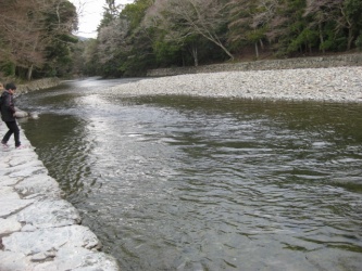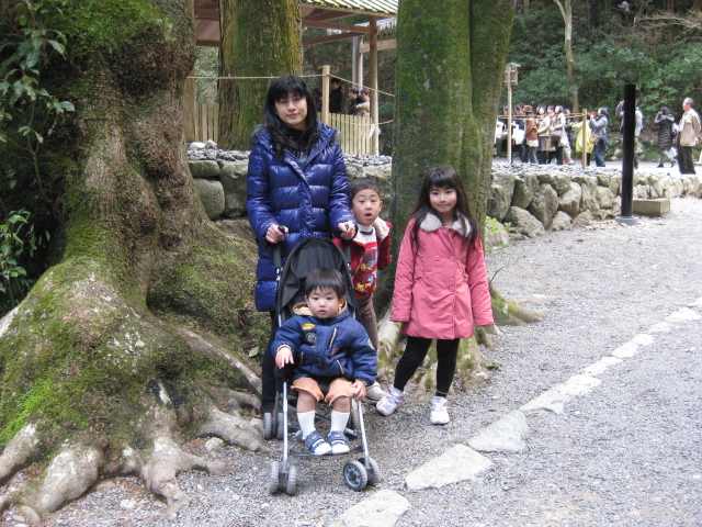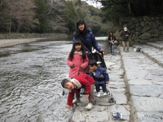 五十鈴川のほとりで写真を撮った。 神社の中の様子のビデオは →ここ | 川の流れは思ったより速い。 水を手ですくったりして少し遊んだ。 子供達は大喜び!。