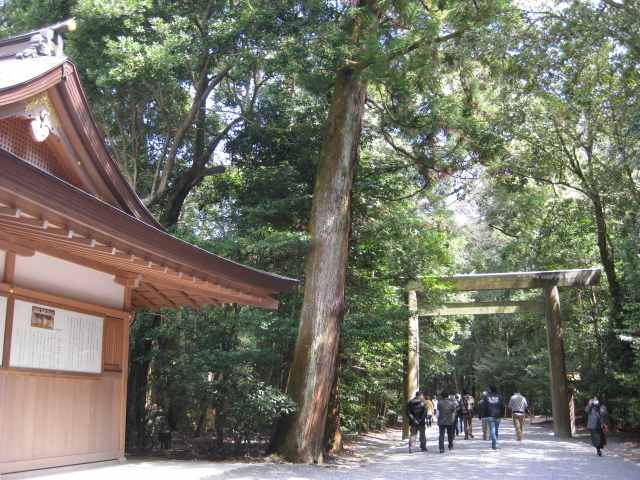 少し歩いていると知らないおじさんが「亀石だよ。写真はこっちから写すといいよ」と | 主人に話しかけていた。 よく見れば亀に見えるねと写真を撮った。 歩いてくる人に「亀石」の説明していた。 親切なおじさんがいるんだね。(笑) 外宮を1時間位、歩いてまわり駐車場に戻り、次は内宮に向かった。 今日は日曜日のせいなのか、内宮に向かう車で、ひどい渋滞だった。 ガックリ〜〜 7kmの距離を2時間以上もかかって、やっとたどり着いた。 <内宮> 内宮は、皇室の御祖先の神で、日本人の総氏神とも言われている、天照大御神 (あまてらすおおみかみ)を祭っています。 先に出来たのが内宮です。
