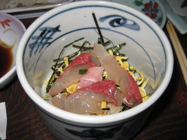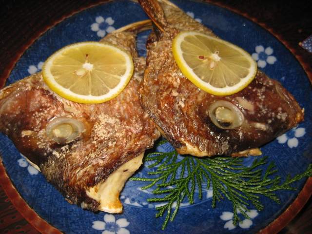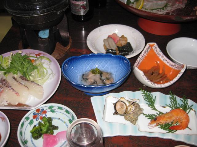 品数の多さにも驚いたし、さすが新鮮な魚を使った料理は美味しさが違う。 | 鯛のしゃぶしゃぶで使った鯛の頭の兜焼きも、出してもらえた。 最後に出てきた伊瀬海老の頭、あらで作った八丁味噌の味噌汁は絶品で感激した。 良質の漁場を持つ五ヶ所湾ならではの美味しさだと思った。 今朝、水揚げされたばかりの新鮮な魚をお造り、焼き、鍋(鯛しゃぶ)で食べる事が 出来たなんて 中々味わえない最高の贅沢だと、大満足の夕食だった。 |