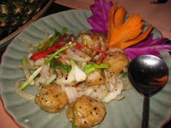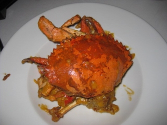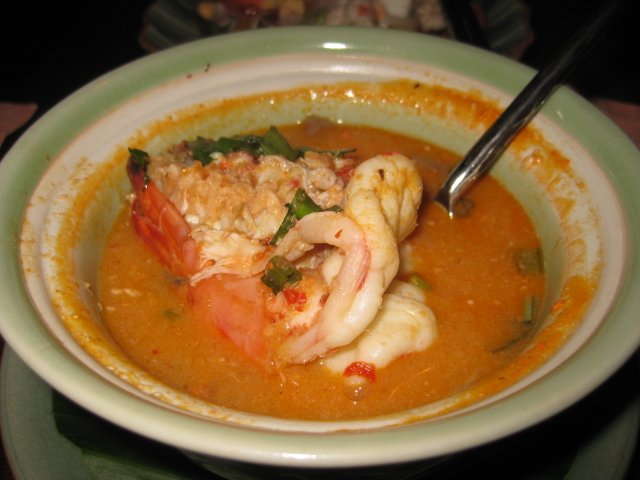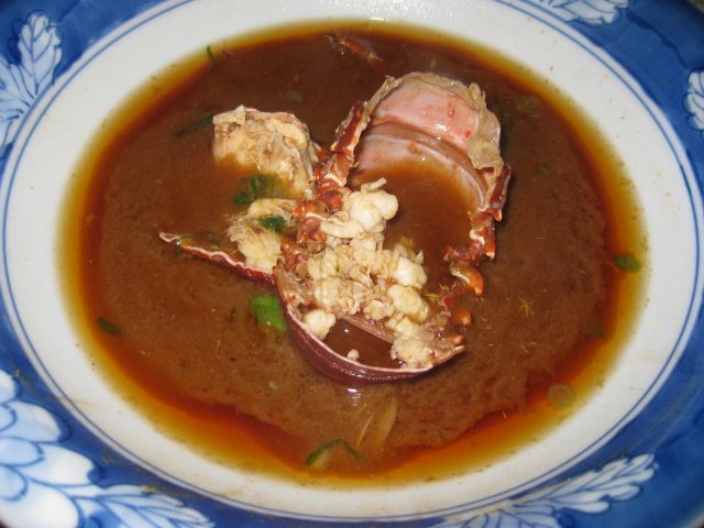 スープには味がついていないので、タイ風のつけだれにつけて食べる。 | 三太さんが、他にもいろんな料理を注文してくれた。 揚げた鶏肉にタイ風の甘辛味噌につけて食べる料理も美味しかったが ワタリ蟹の料理が、すご〜く美味しかった。 蟹の卵がたっぷり入った味付けの 美味しさに、蟹の身を出しながら甲羅まで舐めてしまった。(笑) きのう食べた蟹のカレー炒め(プー・パッ・ポン・カリー)とは違う。 蟹の卵がボソボソしていて美映たちは、あまり美味しくないと感じたらしいが。。