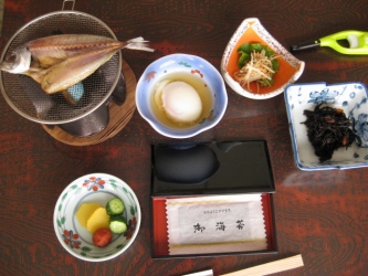 朝食は7時半にしてもらった。 | きのうのしゃぶしゃぶの鯛のあらの煮つけが出た。 美味しかった〜