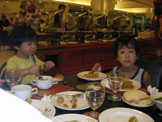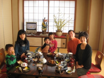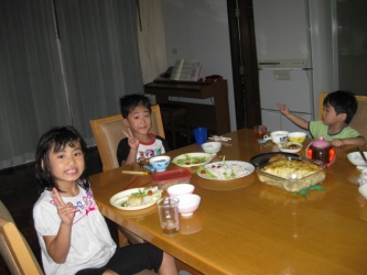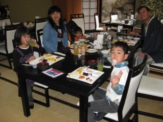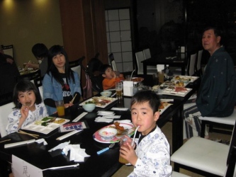 夕食はバイキングなので、子供達は自分で好きな物を取りに行った。 | 子供ってバイキングが好きだよね。 選ぶのが楽しいのかな? 有佳里と光汰朗はこんにゃくの田楽を食べていた。 柑太もこんにゃくが大好きだ。