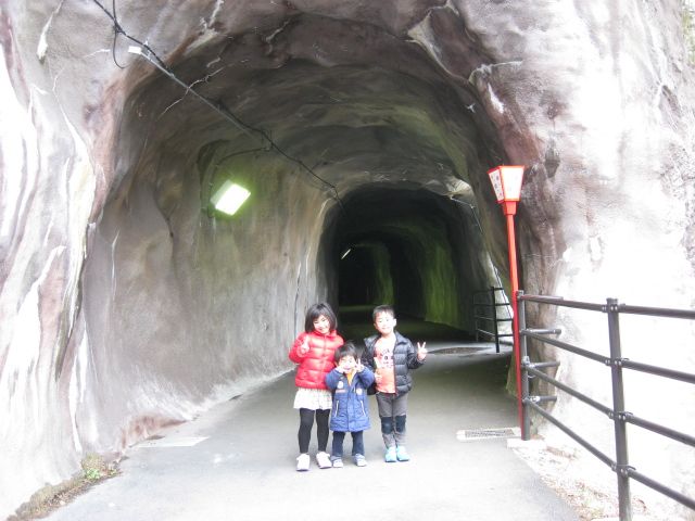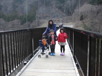 鬼怒川温泉に美映の運転で行ってきた。 主人は風邪気味のため助手席に。。 1月末に貞治家族と行って楽しかったので、同じホテルを予約しておいた。 ホテルに行く前に「鬼怒楯岩大吊橋」(きぬたていわおおつりばし)に寄った。 橋を渡る時に、少し揺れるので怖いけど面白いと子供達は大喜びだ。