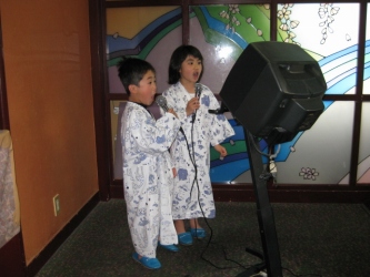 「鬼怒楯岩大吊橋」の手前の広場には、風車の公園があった。 ビデオは →ここ | ホテルに着いて、すぐに温泉に入った。 カラオケ大好きな子供達。 夕食後は混むので、5時頃からカラオケを楽しんだ。 ビデオは →ここ