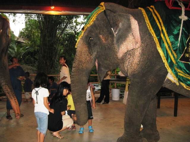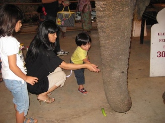 園内に入ると、舞台の衣装を着た団員が待っていた。一緒に写真を撮らせてもらった。 | 象さんに餌をあげる事が出来るとの事で、光汰朗、朝大が怖いながらも喜んで 体験した。 最後に有佳里も恐る恐る餌やりに挑戦! 成功した。 ビデオは→ここ 像乗り体験も出来るとの事だったが、雨がポツポツ降り出してきていたので今日は 中止になった。 ザーと雨が降ってきたら、像から降りるのが大変だからなのかな〜?