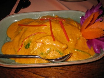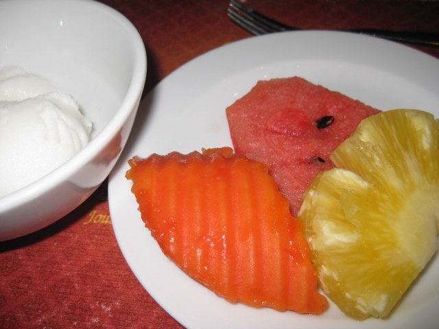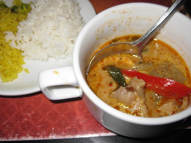 今日はグリーンカレーでなくレッドカレーを選んだ。 | レッドカレーも間違いない味で美味しい〜。 大満足。(笑) 最後にデザートにパパイヤなどの果物とココナッツアイスを、持ってきた。 始めて食べたココナツアイスは、予想以上に美味しくて、お変わりをしてしまった。 お腹がいっぱいなのに、ついつい食べてしまう。 困った事だ。