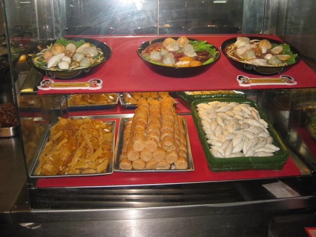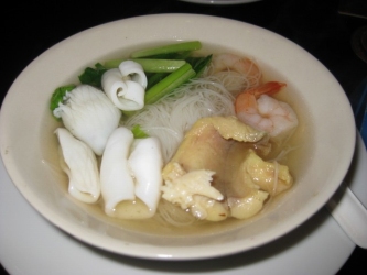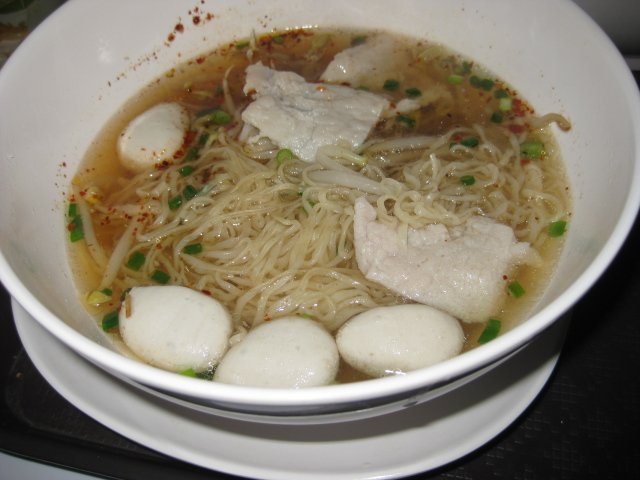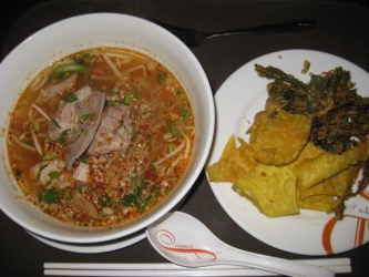 私は、数種類のタイ料理を選んで、お皿に盛りつけた。 スープの美味しい麺も。。