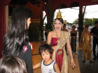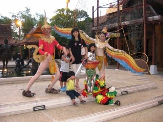 「サイアム・ニラミット」の中に入る前に、写真を撮った。 きれいなお姉さんもね。 | 気づいたら、なんと!朝大がいない。 慌てて皆で探し回ったが見つからない。 園内に入ったかもと、のぞいてみると遠くで走りまわっている子供が見え隠れしている。 黄色のTシャツ姿なので、朝大に間違いないと思った。 切符がないと中に入れないはずだが、小さい子供はすり抜けても分からなかったみたい。 係りの人に頼んで連れてきてもらった。 良かった〜と胸をなでおろした。