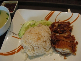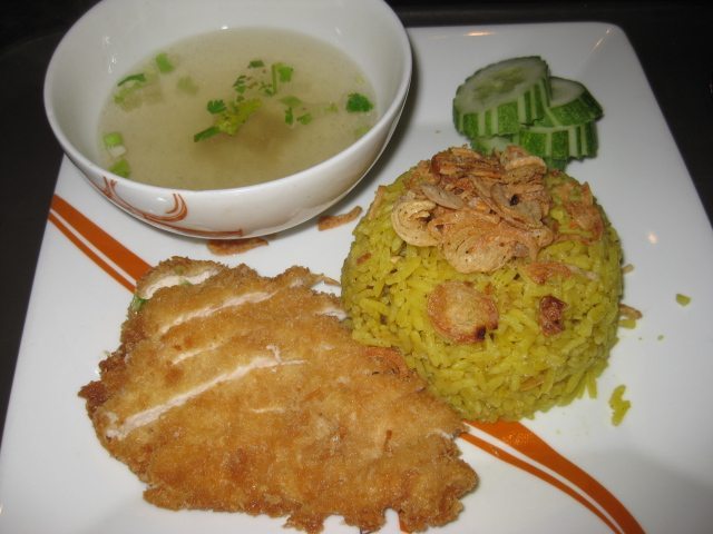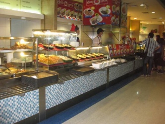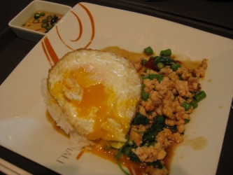 11時30分頃、エンポリデパートの5階で待ち合わせた美映と合流。 | 今日の昼食は、エンポリのフードコートで。。 主人が選んだのは、カレー風味のチャーハンと日本風のかつとスープのセット。 私が選んだのはひき肉のバジル炒め、目玉焼き乗せ。 香辛料の効いたピリカラ味の肉とご飯と半熟目玉焼きを混ぜて食べると。。 この料理は本当に美味しい。 目玉焼きは焼くのではなく揚げてあるのだ。