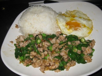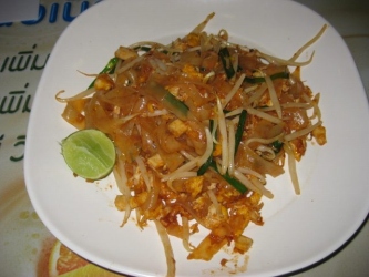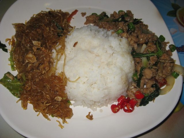 主人が好きな豚ひき肉のバジル炒めとパッタイ(焼きそば)を頼んだ。 | 焼きそばは、量が多めにとタイ語で頼んだら、OKの顔をしていたので、通じたと喜んだ。 日本語が、まるきり分からないタイ人にタイ語で質問された。 海老も多めにする?と聞かれたと解釈した美映は、海老は普通でいいとの意味で 多めでなくていいと「ノー」と答えたら、海老なしの焼きそばが出来上がった。 大笑い! やっぱりタイ語は難しいと美映。 タイに来てからまだ3か月だもの、当たり前だよね。 ちょっと甘めで、香辛料の効いたタイの焼きそばは海老なしでも充分に美味しかった。