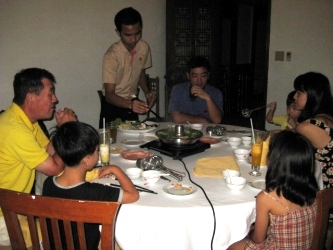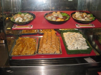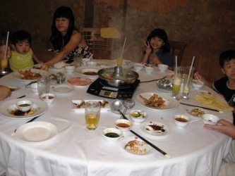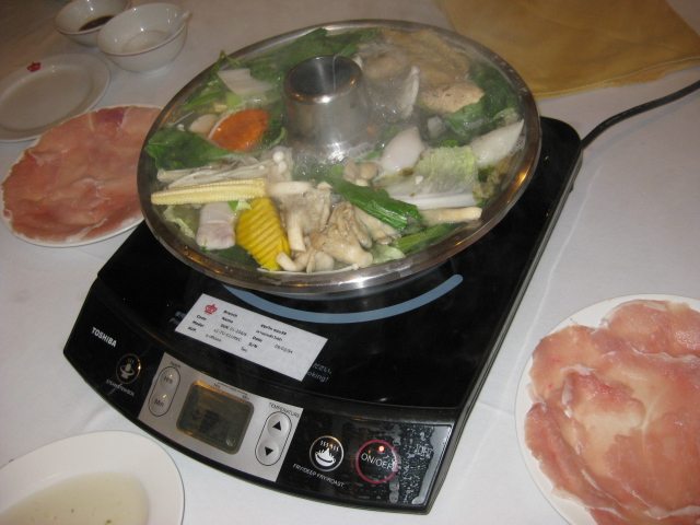 仕事が忙しく、日曜出勤していた三太さんが帰ってきて、夕食はタイスキで有名な | 「COKA」に私たちを連れて行ってくれる事になった。 お店に入ると、お客さんでいっぱいだった。 2階の個室に案内された。 「タイスキ」は「タイのすき焼き」ではなく日本のよせ鍋の水炊きのような感じだ。 人数にたいして、鍋が小さいのではと思ったが、魚介類、つみれ、肉、野菜など たっぷり入れて煮たてていた。 まずビールとジュースで乾杯した。