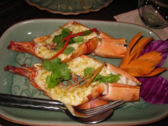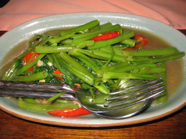 海老のタイ風味付けの塩焼き。 定番の空芯菜の炒め物