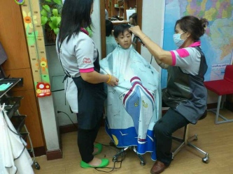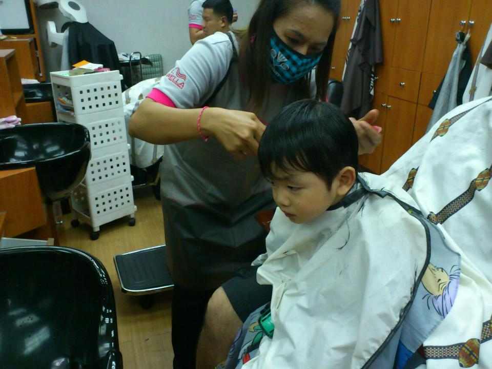 三太さんがゴルフから帰ってきた。 床屋さんに寄ってから食事に行く事になった。 | 客のほとんどが日本人という床屋さんで、光汰朗、朝大が髪を切ってもらった。 光汰朗は、おとなくしていたが、朝大は途中で飽きてしまい心配したが、無事終わった。 2人とも、かっこよく仕上がった。