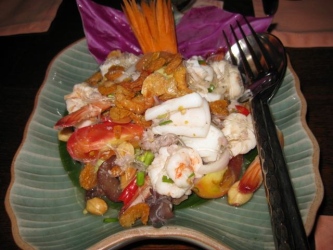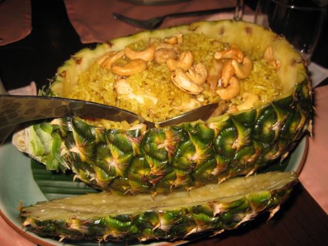 シーフードのサラダ。 次に登場したパイナップルの器に入った炒飯に子供達は大喜び!