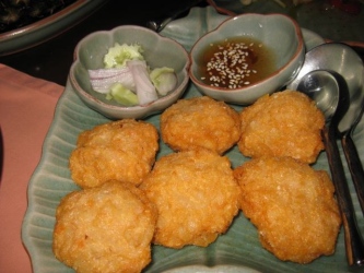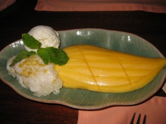 子供たちが大好きな海老のすり身の揚げもの。 もちろん、主人も私も大好物だ。 | 最後は美映が、お母さんに食べてみて欲しいとリクエストしてくれたデザート。 蒸したもち米を甘いココナッツミルクで和えて、果物のマンゴウと一緒に食べるのだ。 甘いもち米とマンゴーが合うなんてと。。 初めて食べたタイのデザートのとりこに。。(笑) それに大好きなココナッツアイスも添えられていた。 「カオニャオ・ マムアン」というタイ伝統のデザートは、日本に帰って作ってみようと思った。 もち米とココナツミルク缶とフィリッピン産のマンゴーなら手に入るから。。