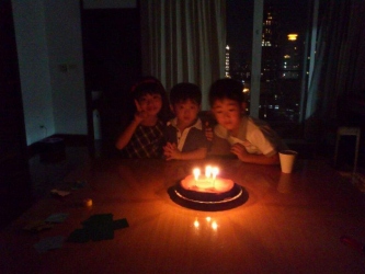 今日は6月30日。 朝大の3歳の誕生日だ。 | 家に帰ってきてから、ママ手作りのケーキに3本のローソクを立てて「Happy Birthday」の 唄を歌ってお祝いをした。 朝大は嬉しそう〜 そのビデオは→ここ |