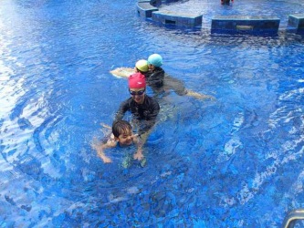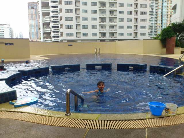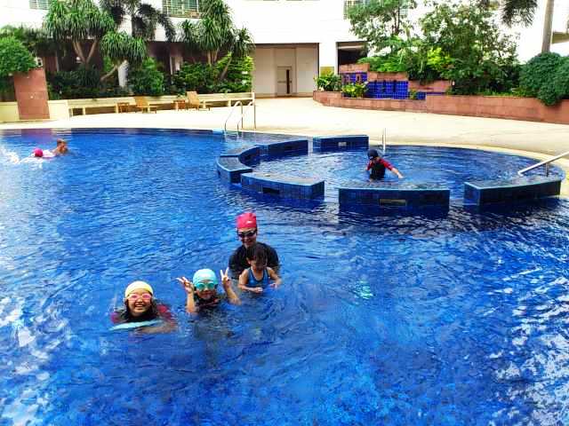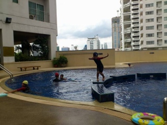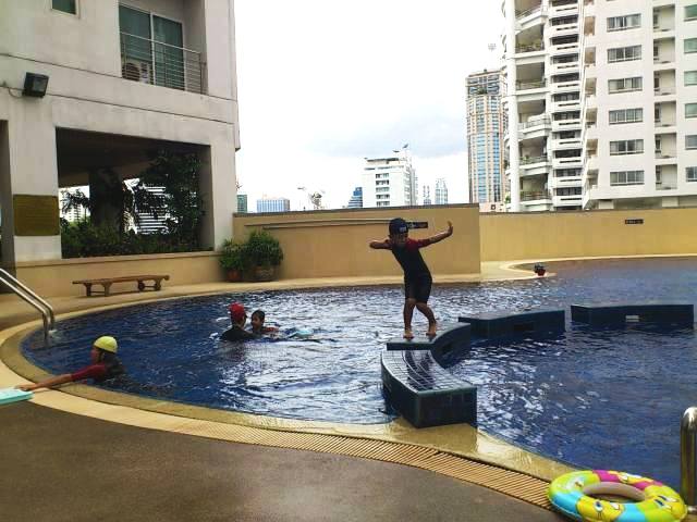 タイ(バンコク)6日目。 主人は早朝から待望のゴルフに出かけた。 バンコク日本人会テニスクラブで知り合いになったOさんに、美映がゴルフ好きの 父親の話しをしたら、日曜日にご夫婦でゴルフに行かれる予定との事。 一緒にどうぞと誘ってくださったのだ。 私と子供達は、マンション5階にあるプールで泳ぐ事になった。 私は、持参してきた水着の上に日焼け防止の長袖のウエアを美映から借りて着た。 そして美映に私のデジカメを渡し、子供たちの写真とビデオを撮ってねと頼んだ。 リゾートホテルのプールの様な雰囲気だ。久しぶりに泳げると思うと少しワクワクしてきた。 マンションに住む欧米人の体格のいい婦人がプールから上がり出ていく所だった。 国際的〜と思った。(笑) 日本人のママたち数人がプールサイドの椅子で雑談中。 「おばあちゃん、見てて」と光汰朗が泳ぎ出した。 愛知のスイミングスクールで「蹴伸び」が出来ずにいた光汰朗が、嘘のようにクロールで 20m以上、泳げるようになっていたのには驚いた。 このプールでおこなわれるスイミング教室で週1回、習うようになって上達したらしい。 朝大と光汰朗のプールでの様子のビデオは →ここ
