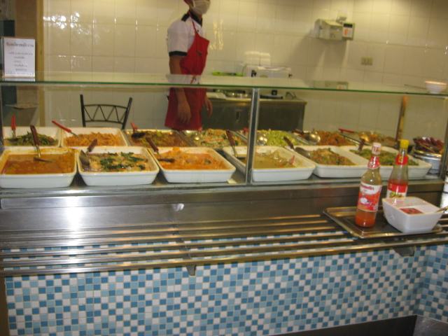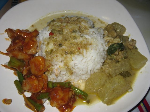 昼食はフードコートへ。。 | タイの人はおかずを色々選び、ごはんの横に入れてもらうスタイルなので、真似をした。 私は好みのおかず2種類を指差した。 ご飯の両横に盛りつけてくれた。