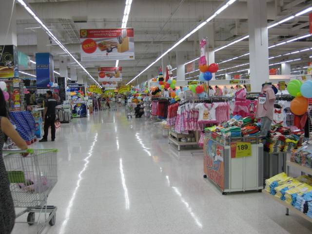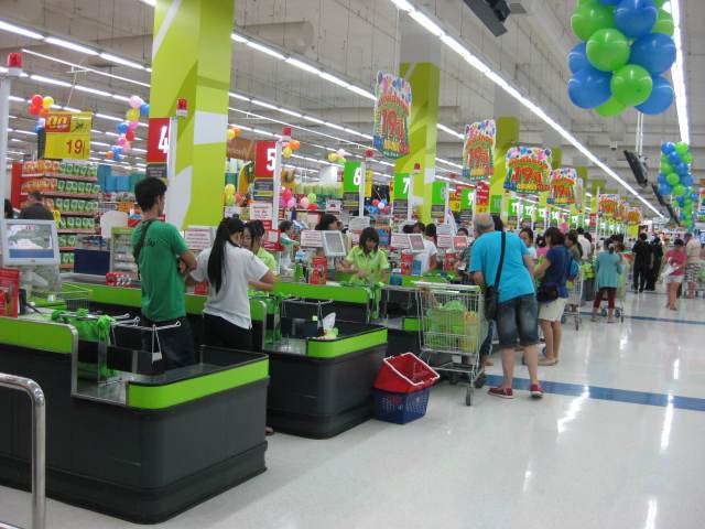 広い売り場と品ぞろいには、ビックリした。 | 世界2位のフランスの大手スーパー「カルフール」が進出したスーパーだったが 経営不振のため、撤退し「ビッグC」に売却されたとの事。 買い物客は、日本人他、外人も多いが、デパートと違ってタイの人がかなり多い。 レジの数の多さには驚いた。端から端までかなりの長さだ。全てのレジが見渡せない。 大量の買い物をする人が多いので、買い物の量が少ない人用のレジがあるらしい。 美映は知らなかったので、大量買いした時に並んでいたら注意されたんだって。。 そして買った物をレーンに乗せてレジで精算してもらう。 レジのビデオは→ここ