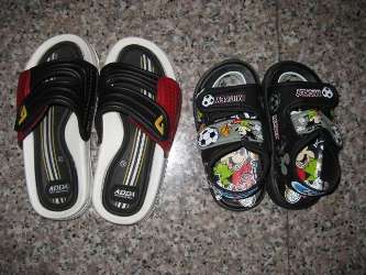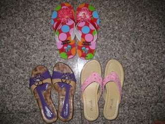 有佳里のサンダル3足と光汰朗と朝大のサンダルの写真。 | 有佳里は紫のサンダルが1番のお気に入りのよう。 他のサンダルも気に入って 何回も履いてみて大喜びだった。 光汰朗も朝大も1足しか買ってあげられなかったが、思いの他 喜んでいたので嬉しかった。