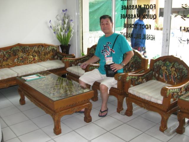 タイ(バンコク)10日目。 6月26日の深夜にバンコクに到着してから10日。 ついに明日、日本に帰る。 その前に行きたい所が2つある。 2回目だがマッサージ店。そしてネイルサロン。 美映に教えてもらった有名なマッサージ店に主人と2人で行く事になった。 美映は9時から11時までタイ語教室なので、その間にマッサージをしてもらう事に。。 マンション前9時発のトゥクトゥクに乗りプロンポン駅まで、その後 徒歩でマッサージ店に。 高級な感じはないが、繁盛しているお店だ。 朝なのにお客さんでいっぱいだった。 日本人の芸能人、有名人の色紙が飾ってある。 椅子に座っている主人をパチリ! 受付けでタイ古式マッサージを2時間で、お願いして 料金を払った。 足を洗ってもらい、カーテンで仕切られた部屋に通され、用意してある簡単服に着替えた。 まず足から始まった。 1時間は足だけ集中してマッサージ。 残りの1時間は全身マッサージだった。 程良い強弱をつけてのマッサージ。 2時間の長時間だったので、主人も私も満足感でいっぱい! それなのに、チップを入れても1000円位だった。 安くてビックリ〜〜