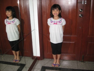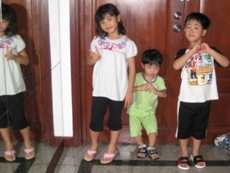 食事が終わってから、プレゼントしたサンダルを履いて記念写真を撮ろうと玄関に。。 | いつも夕食前に、お風呂に入るので、パジャマ姿だが、仕方ない。(笑) 有佳里は紫のサンダルで1人の写真を撮った。 朝大は、横の鏡に映った自分の姿が気になって、正面を中々むかない。やっと撮れた!