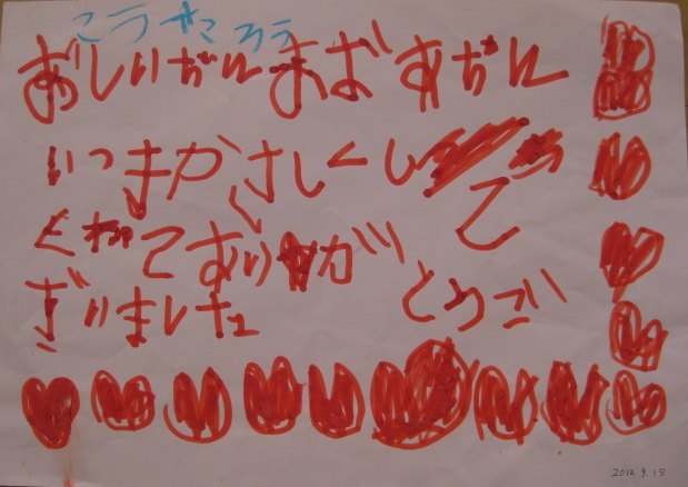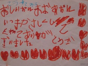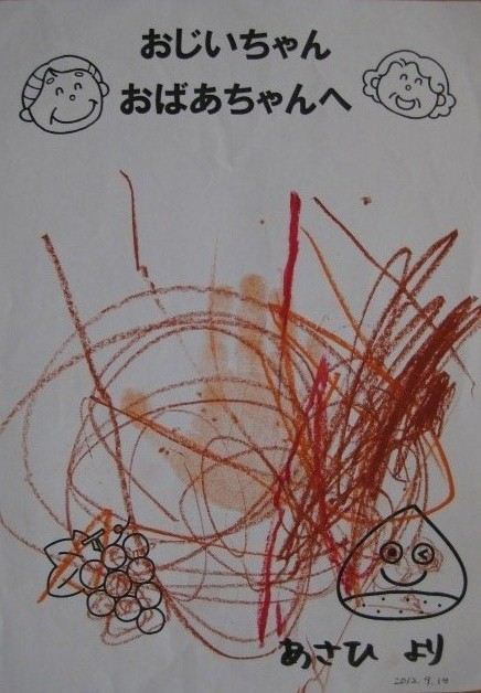 光汰朗が書いたお手紙には | 「おじいちゃん、おばあちゃん、いつも やさしくしてくれてありがとうございました」と 書いてあった。 初めての子だった有佳里の時は 字を遊びながらママが 教えている様子を見た事があったが光汰朗はなかった。 自分で覚えたのだろうか? いつの間にか字が書けるようになっていたんだね。 すごい! 朝大の絵は →ここ 何を描いたのかな?(笑) 柑太の絵は、おじいちゃんとおばあちゃの顔を描いてくれたんだね。 貞治は親の血をひいたのか 絵を描くのが苦手だった。 小学校1年生の遠足で描いた絵が、何の絵か分からなかったので聞くと「おにぎり」との事。 白い画用紙に白いクレヨンで描いた真ん中に赤のクレヨンで描いた丸が。。 白いクレヨンがご飯で赤いクレヨンが鮭なのかと納得し、大笑いした記憶がある。 それに比べれば、柑太は数段、上手な絵を描いているね。 髪の毛もおばあちゃんの方が長く描いているもの。 観察力がある。(笑)