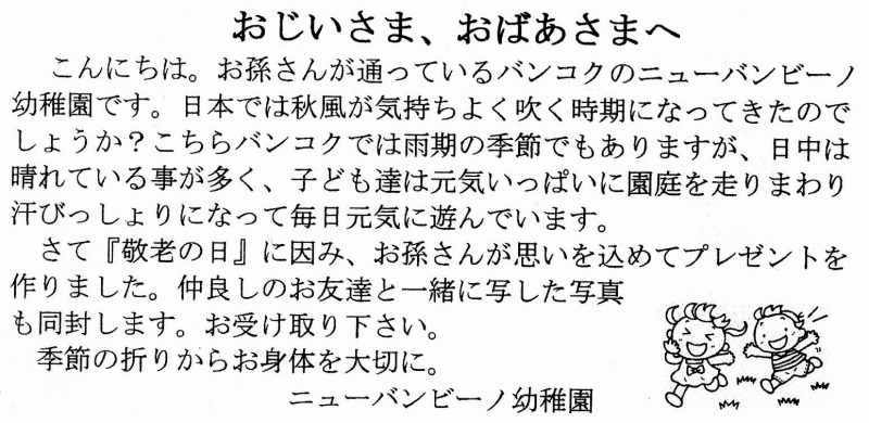 「敬老の日」のプレゼント(幼稚園が企画した)が入った封書が、 タイと上海から届いた。 タイの幼稚園からのお手紙は→ここ 光汰朗と朝大が通う幼稚園で写した写真は↓。